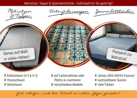 Damit das nicht so bleiben muss, haben wir unser Sortiment erweitert und bieten seit Anfang 2024 maßgeschneiderte Matratzen und Topper sowie Spannbetttücher für Wohnmobile, Caravans oder Boote.