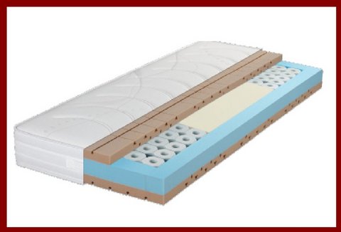 3-Schicht-Aufbau mit unterster Schicht aus festem Grundschaum als stützende Basis. Darauf die mittlere Schicht aus Kaltschaum mit Lüftungskanälen und darauf die Liegefläche aus druckentlastendem Viscoschaum.